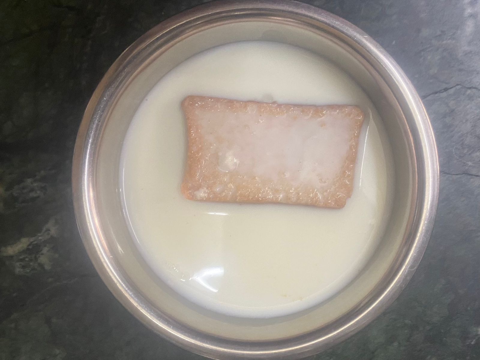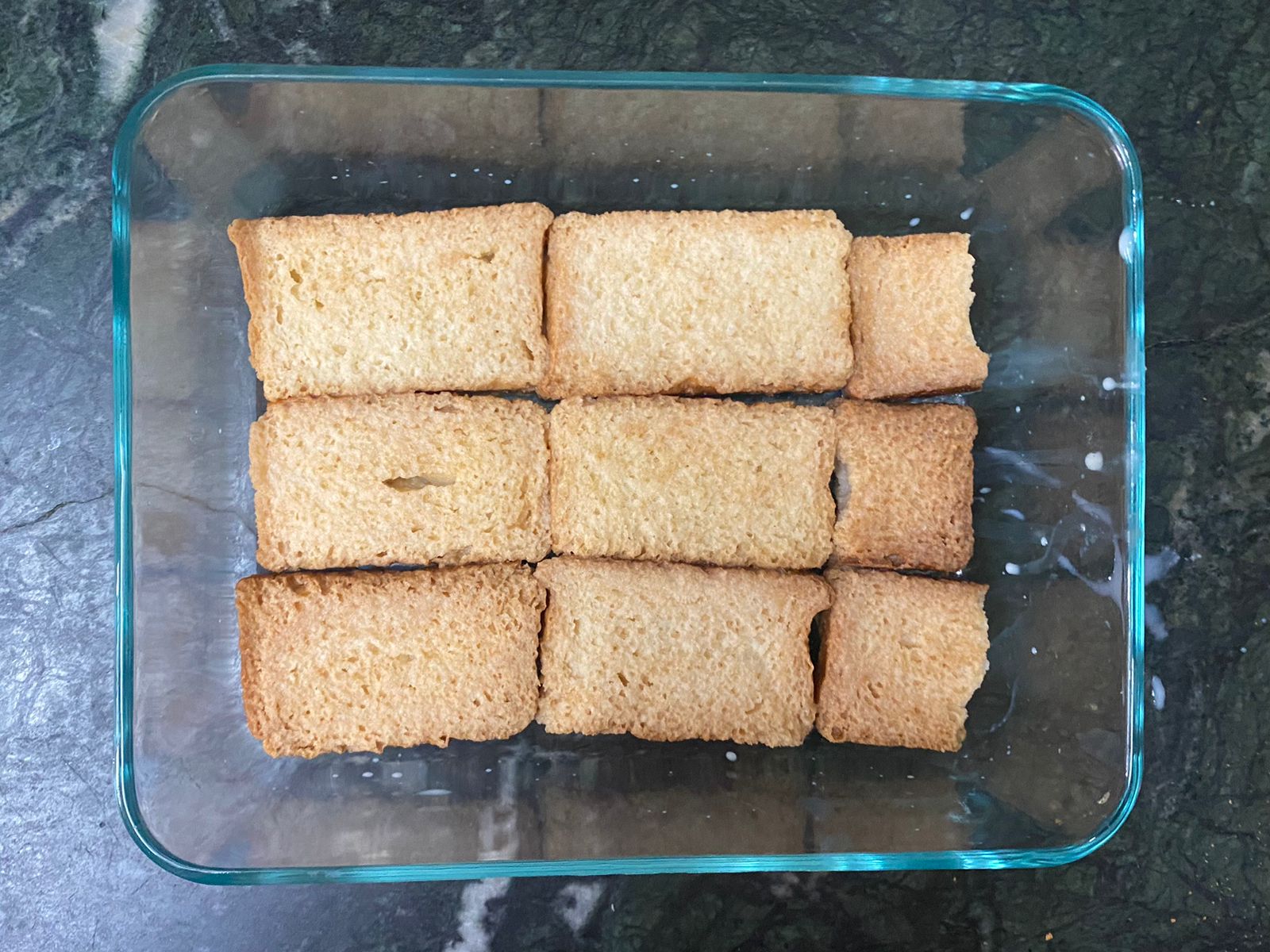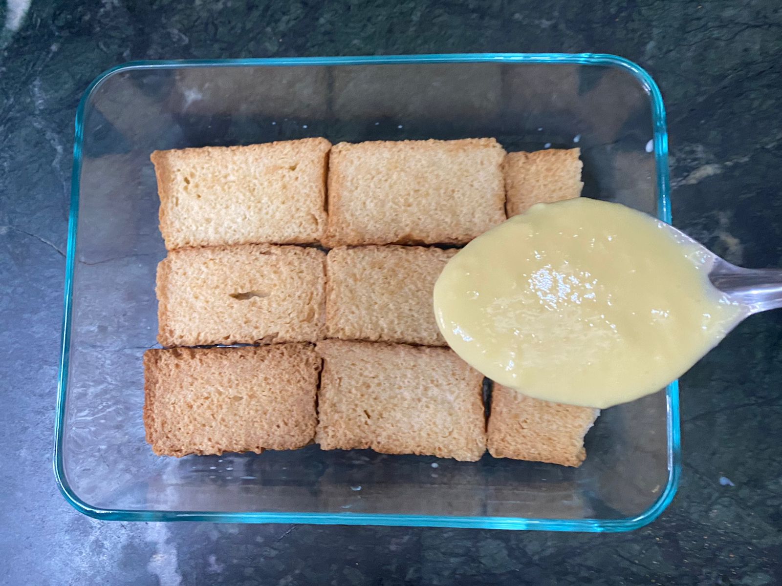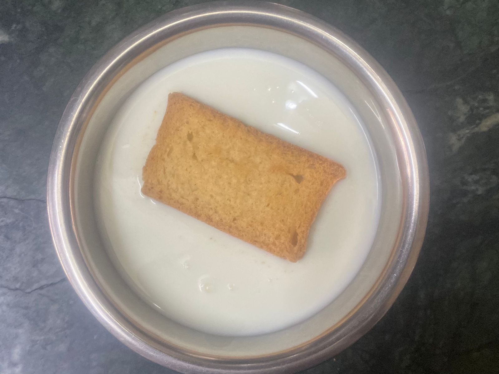 For assembling, soak the rusk in the milk for 30 seconds and layer it in a serving dish.