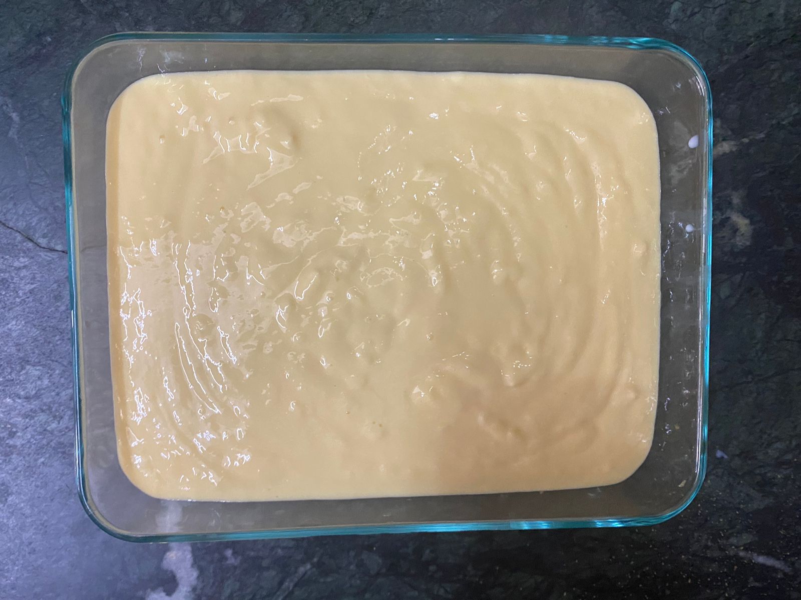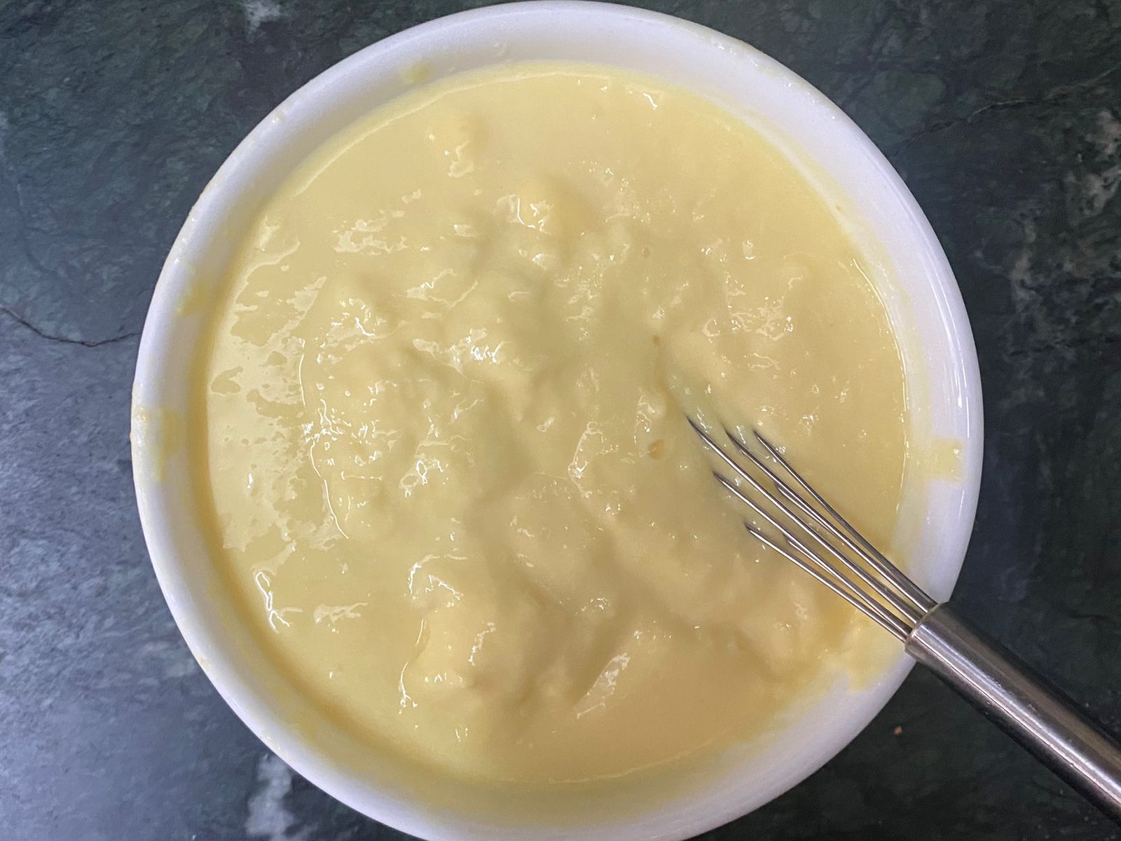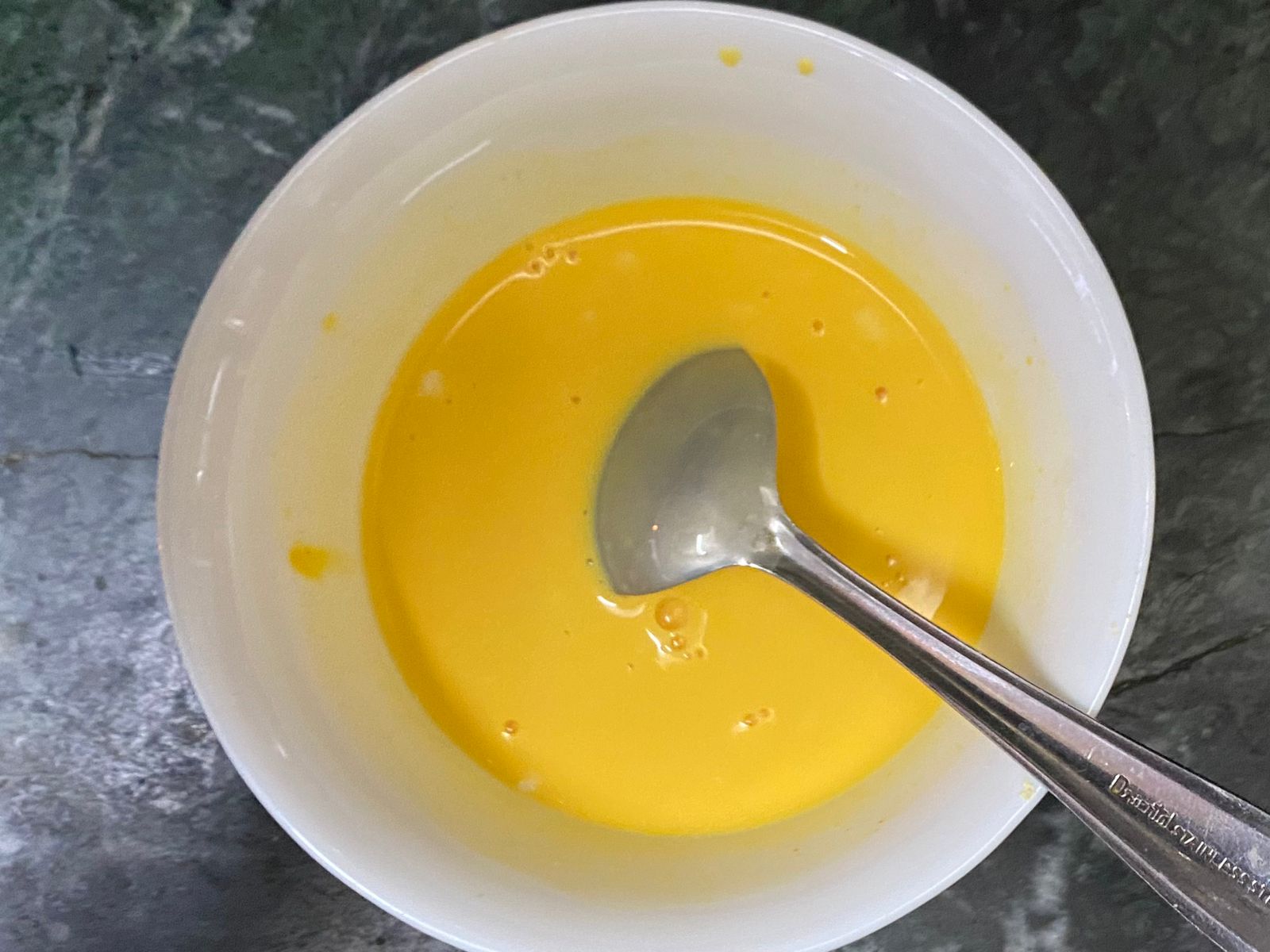 While the milk is boiling, add 2-3 tablespoons of warm milk to the custard powder and whisk. Make sure there are no lumps in the custard. You can add more milk if needed to make a smooth consistency. It should almost be like a thick batter or double cream consistency. I always use room temperature or warm milk to mix with custard as hot milk can sometimes curdle the custard.
