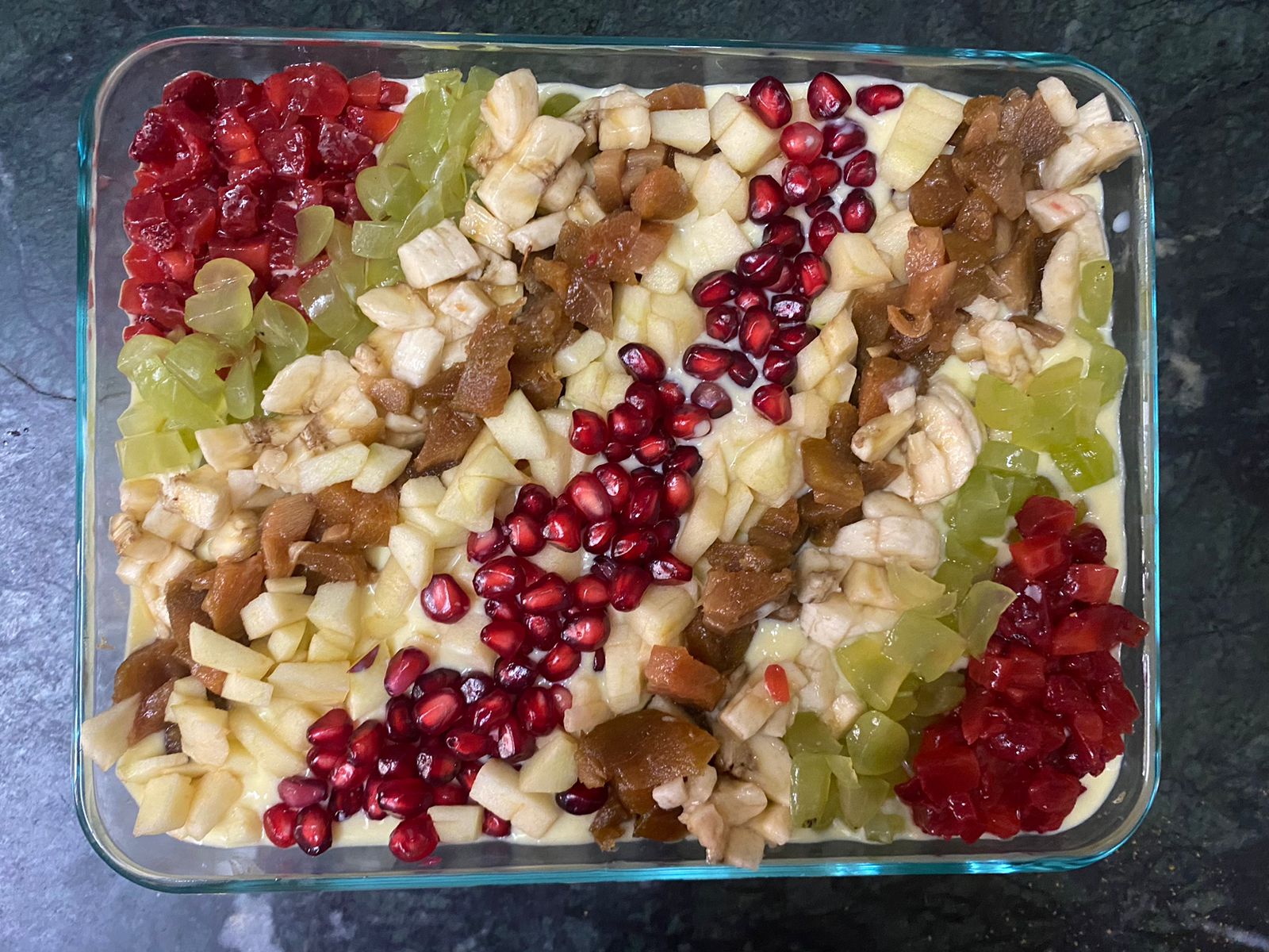 This is my ‘shortcut’ recipe because I use custard powder to whip up a quick 15-minute dish. If time allows, you’re welcome to prepare fresh custard. I opt for eggless vanilla custard powder, which I find enhances the natural flavours of the various fruits added. However, feel free to experiment with other custard flavours like banana or mango, which also complement this recipe well.