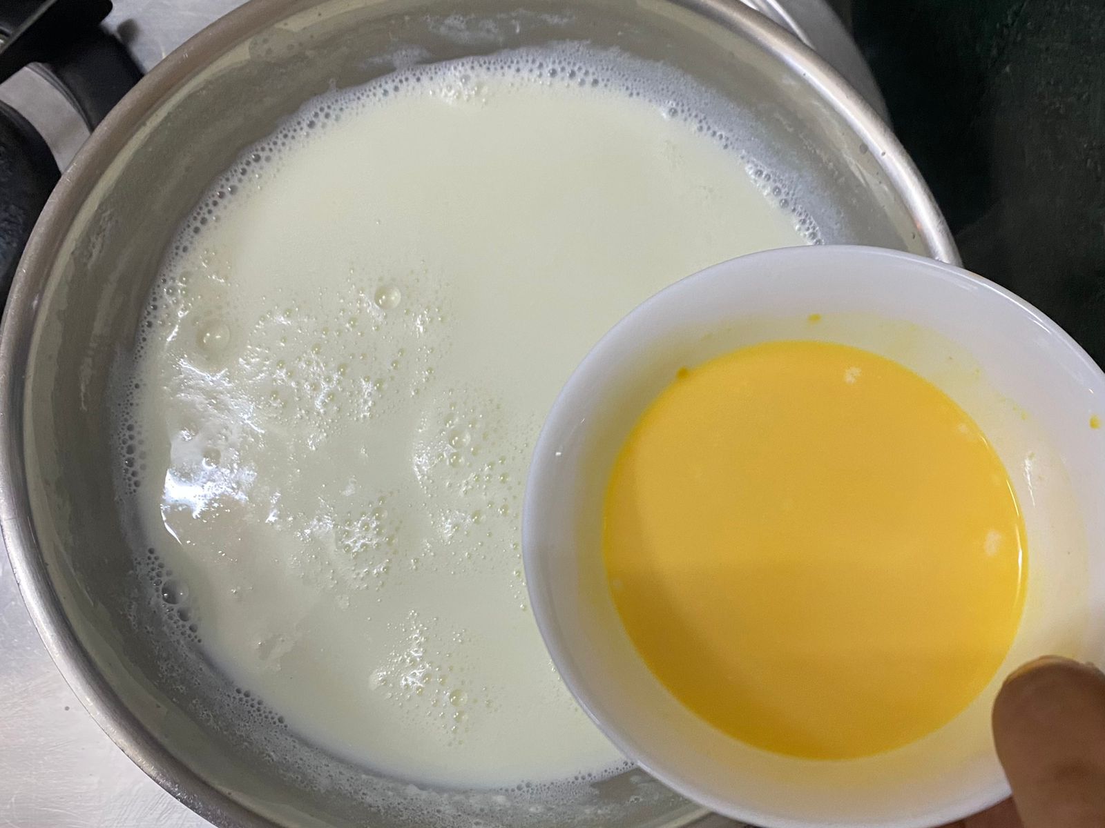 - Once the milk has boiled for 5-7 minutes turn off the heat and add the prepared lump free custard powder in the milk and stir it continuously to mix everything together until the custard has thickened to a thick smooth consistency.