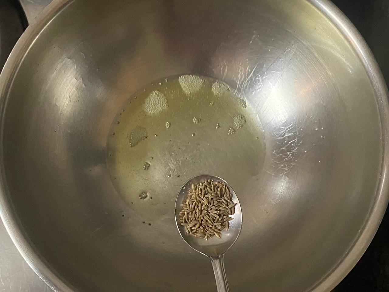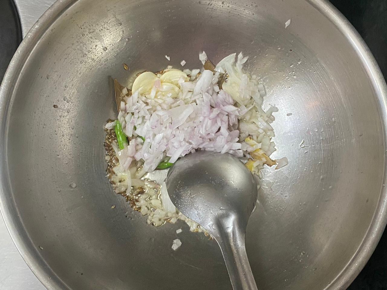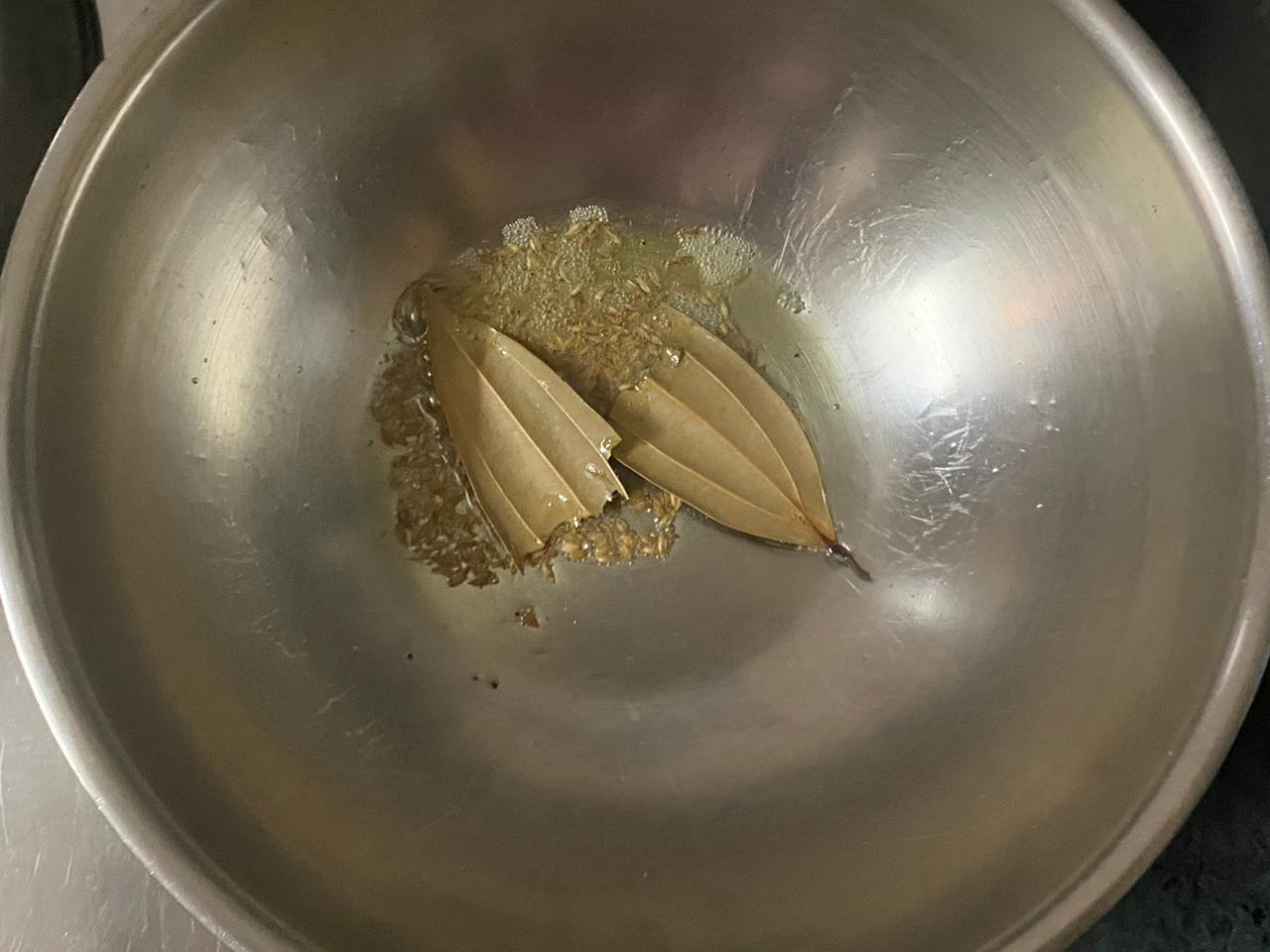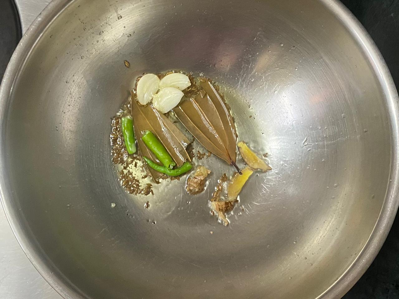 Heat ghee and add the cumin seeds and bay leaf. When the cumin seeds begin to splutter add green chilli, garlic, ginger and onions. Sauté on medium heat for 3-4 minutes or until the onions begin to turn translucent.