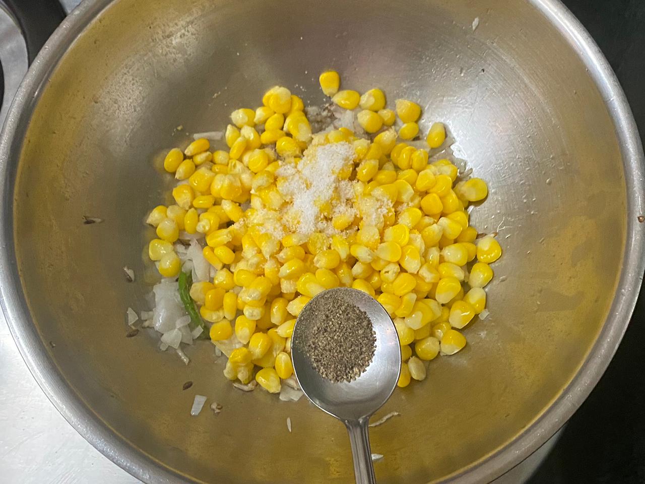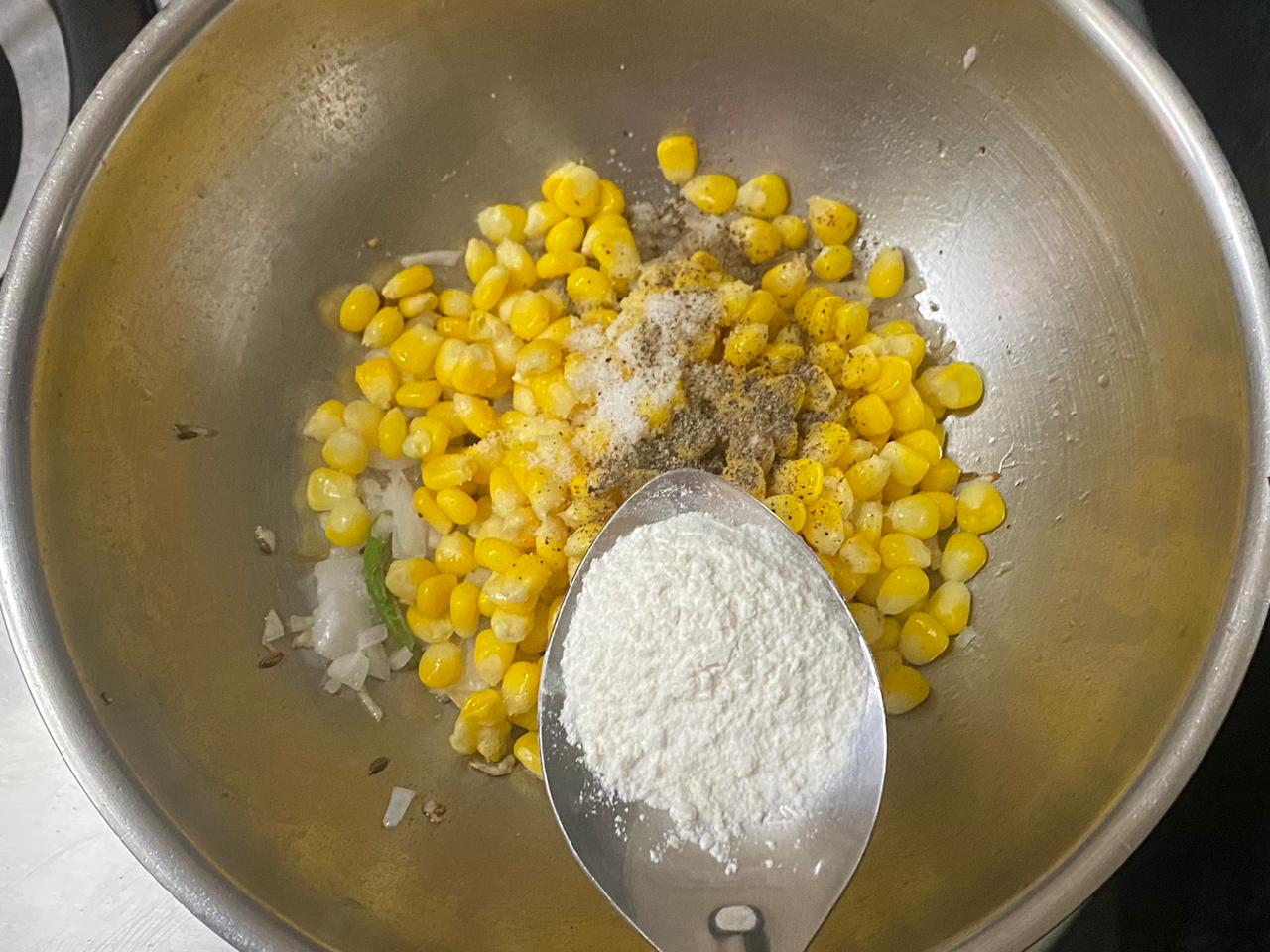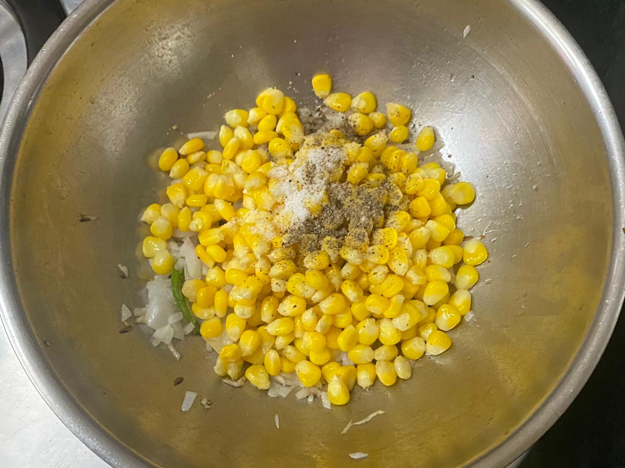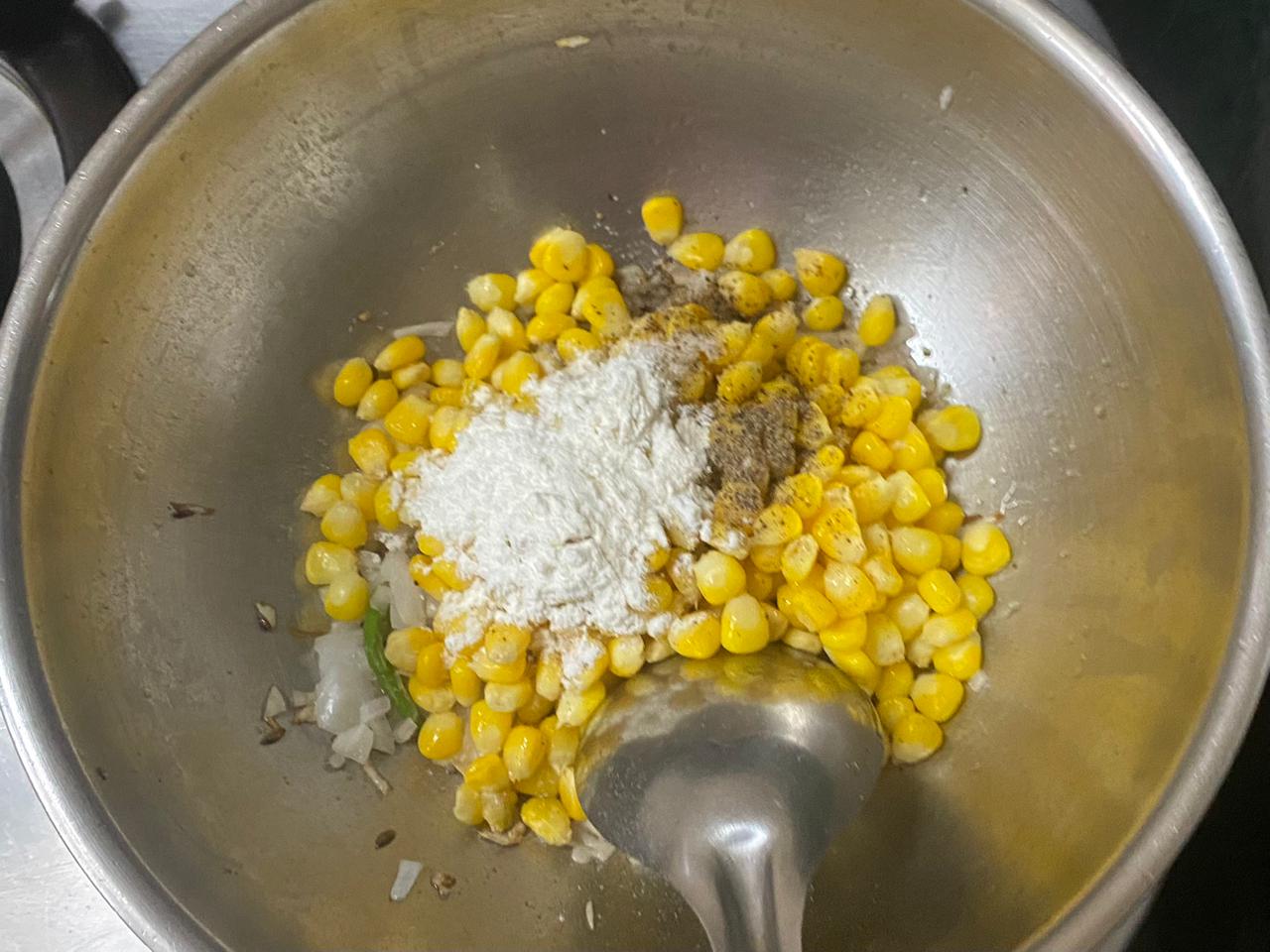 Next add corn kernels, salt, black pepper and corn flour. Sauté on low heat for 2-3 minutes to cook off the flour and then add water.