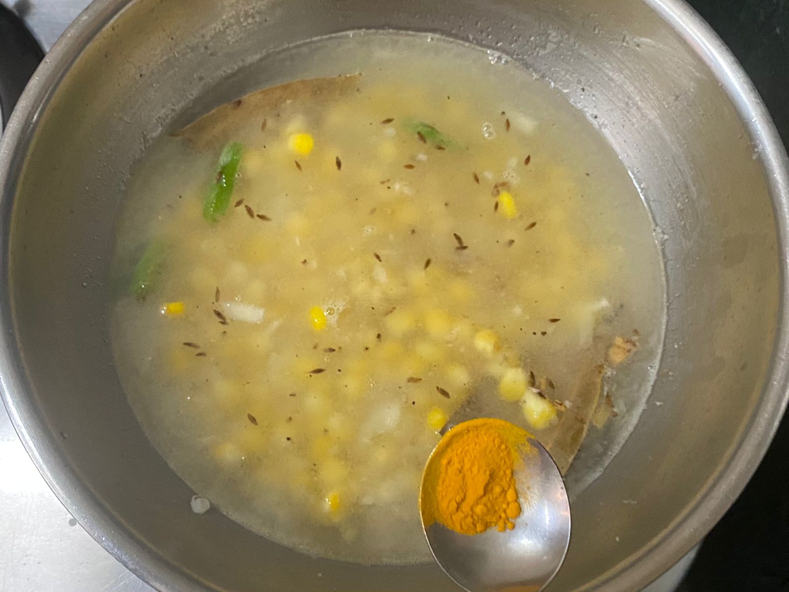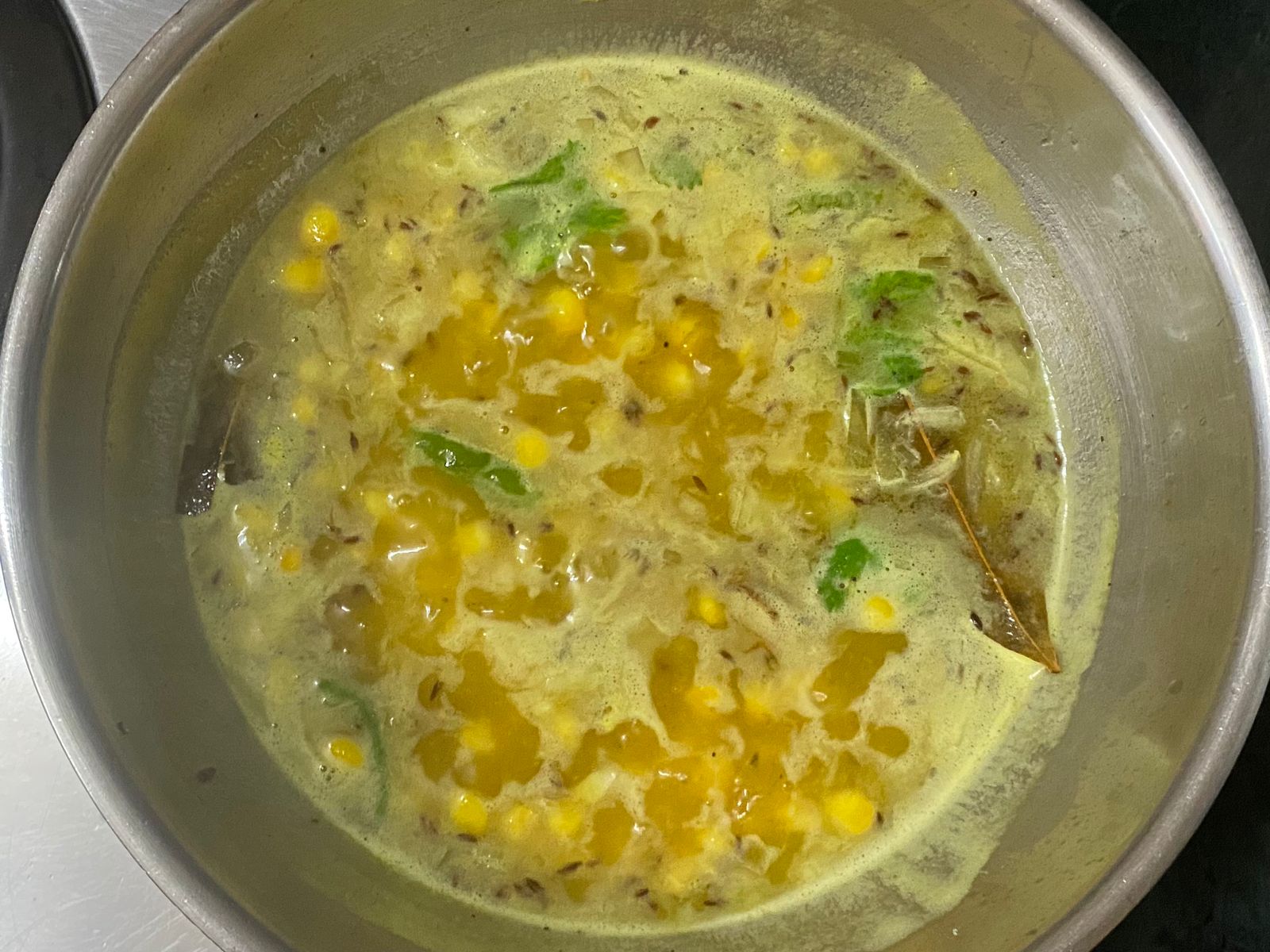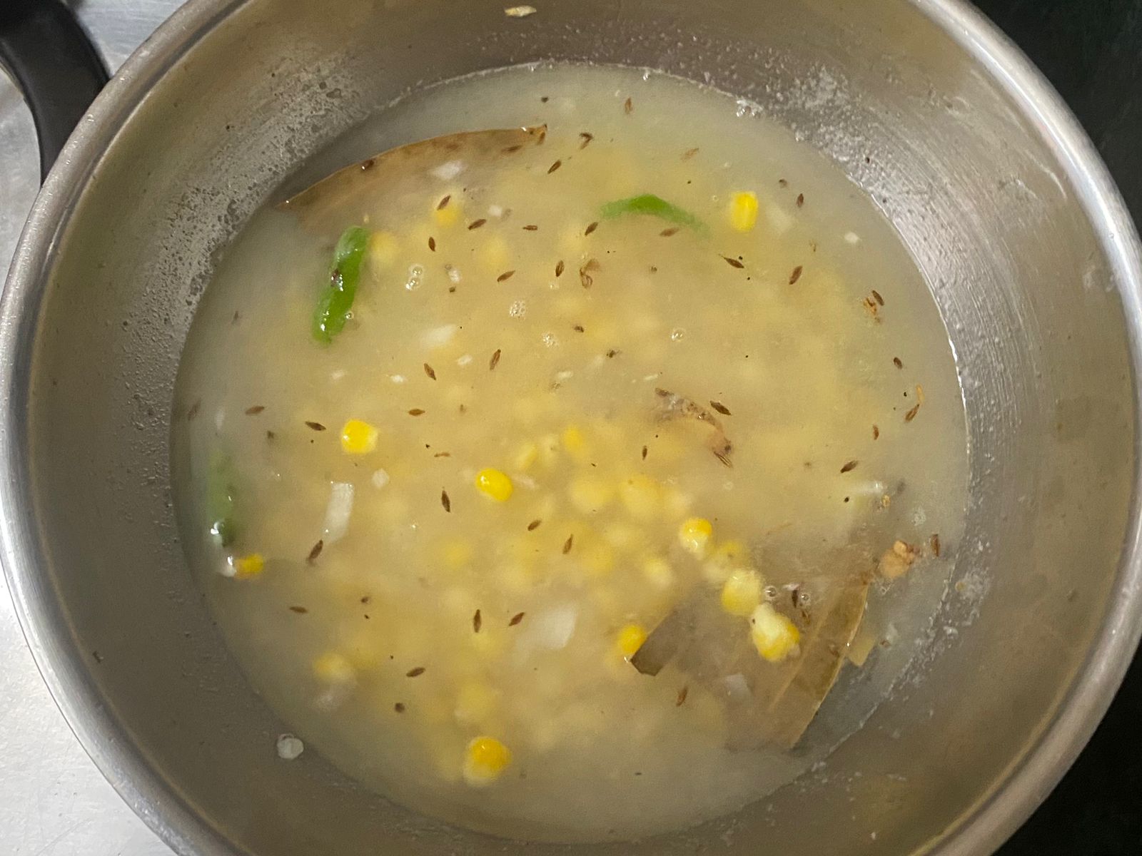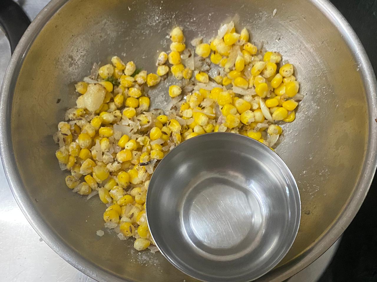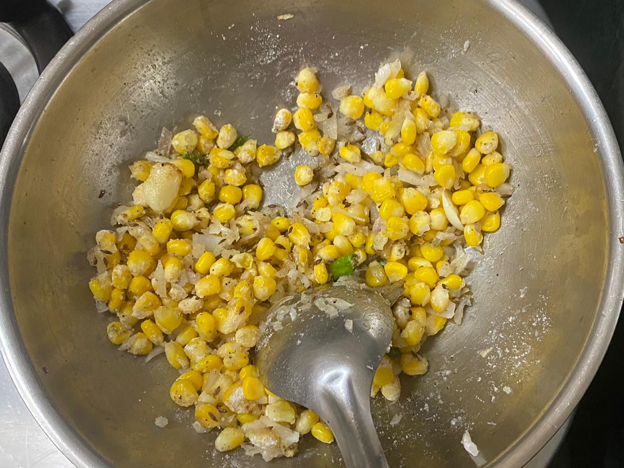 Next add corn kernels, salt, black pepper and corn flour. Sauté on low heat for 2-3 minutes to cook off the flour and then add water.