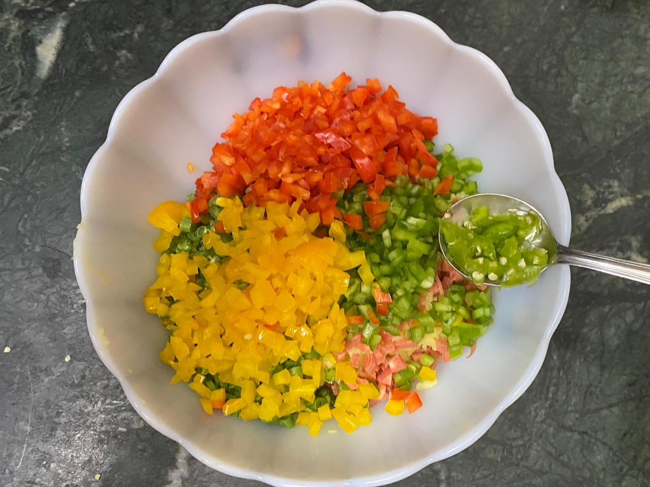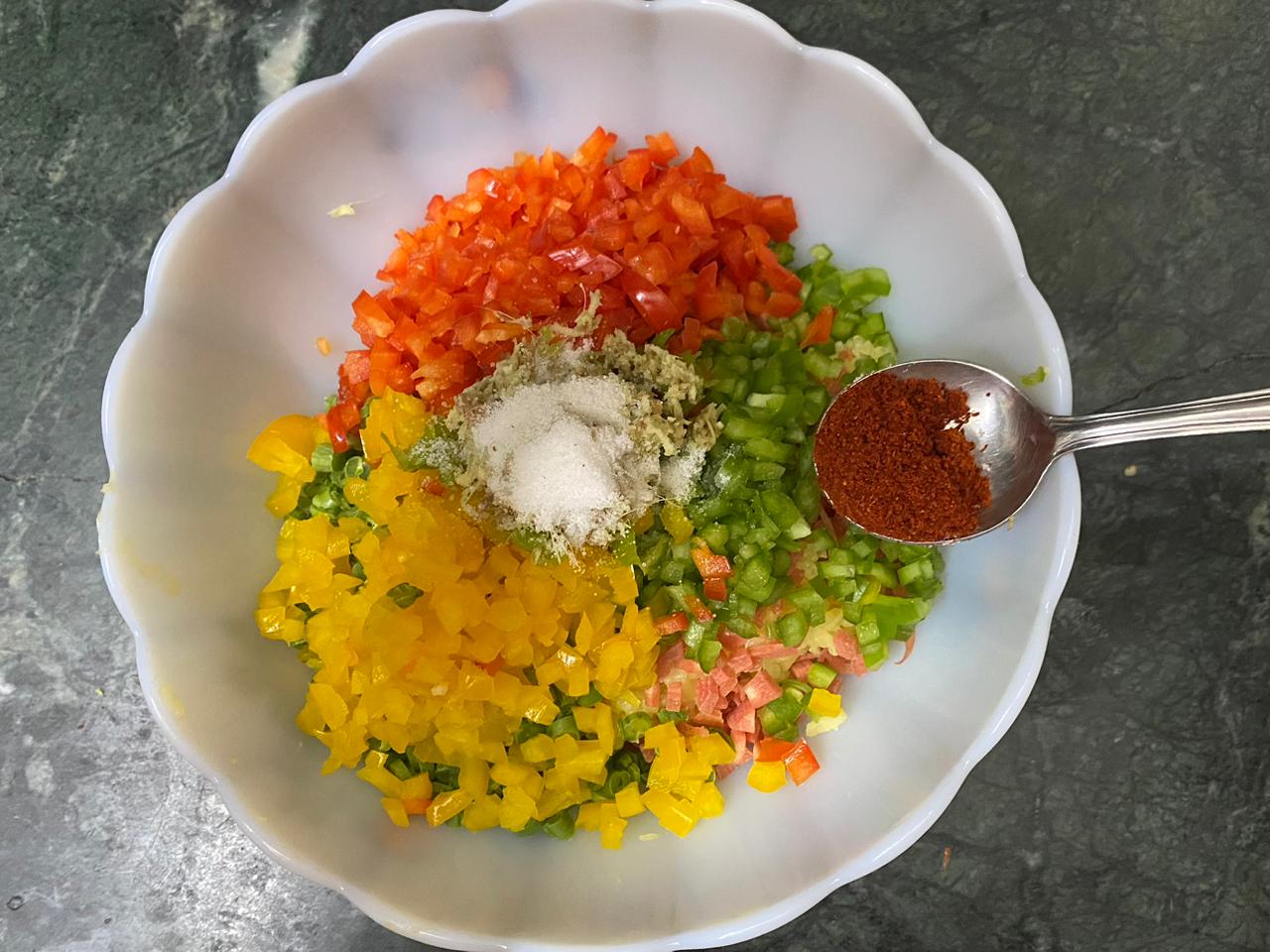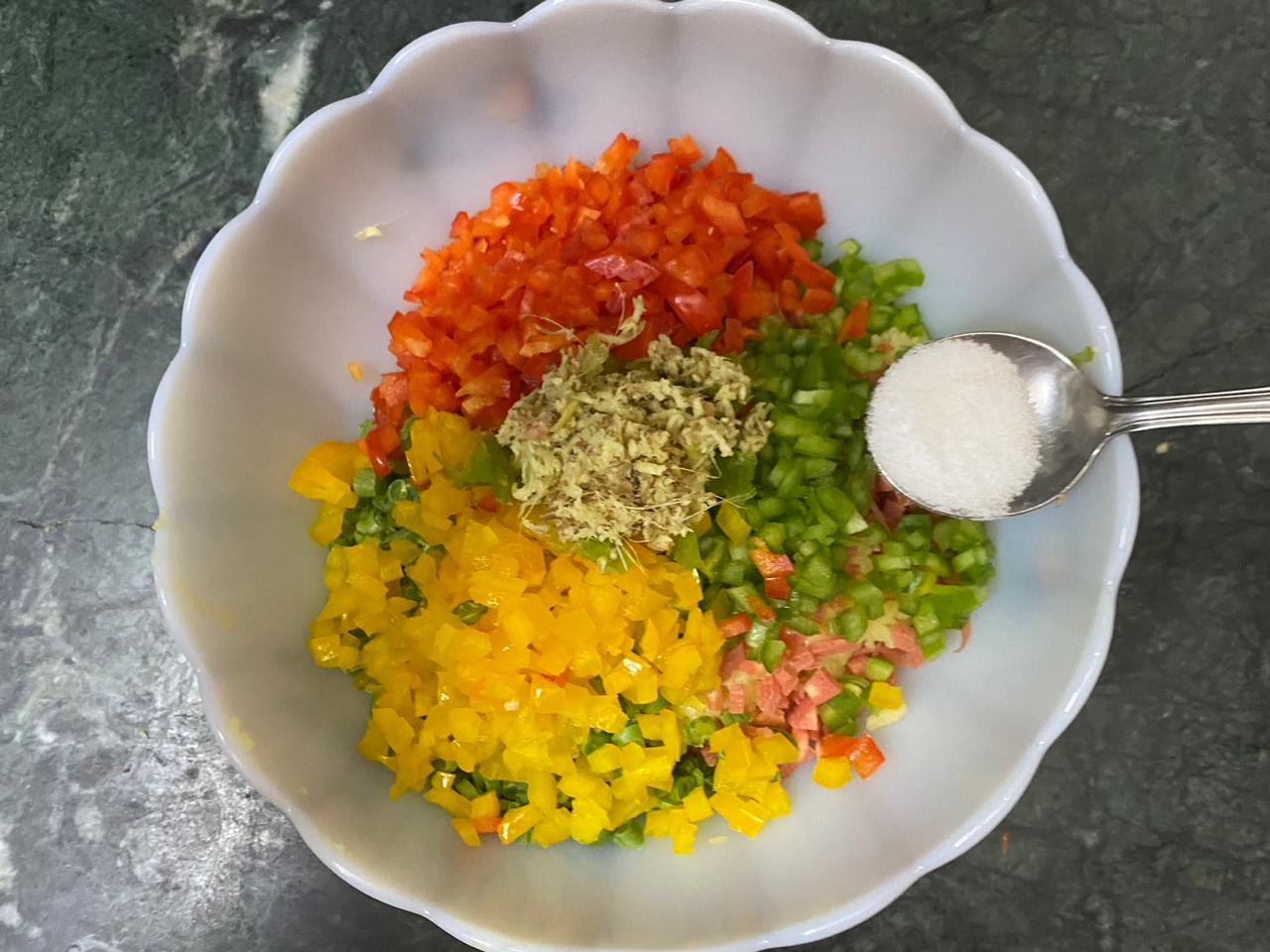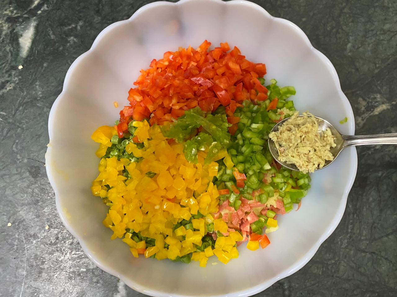 In a bowl, mix potatoes, carrots, French beans, green pepper, yellow pepper, red pepper, green chillies and ginger.