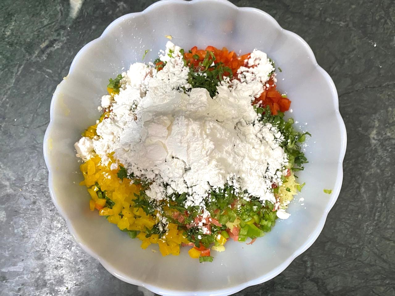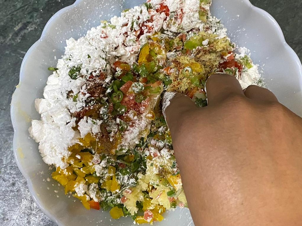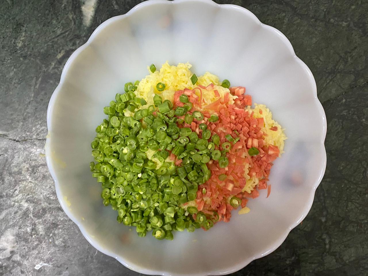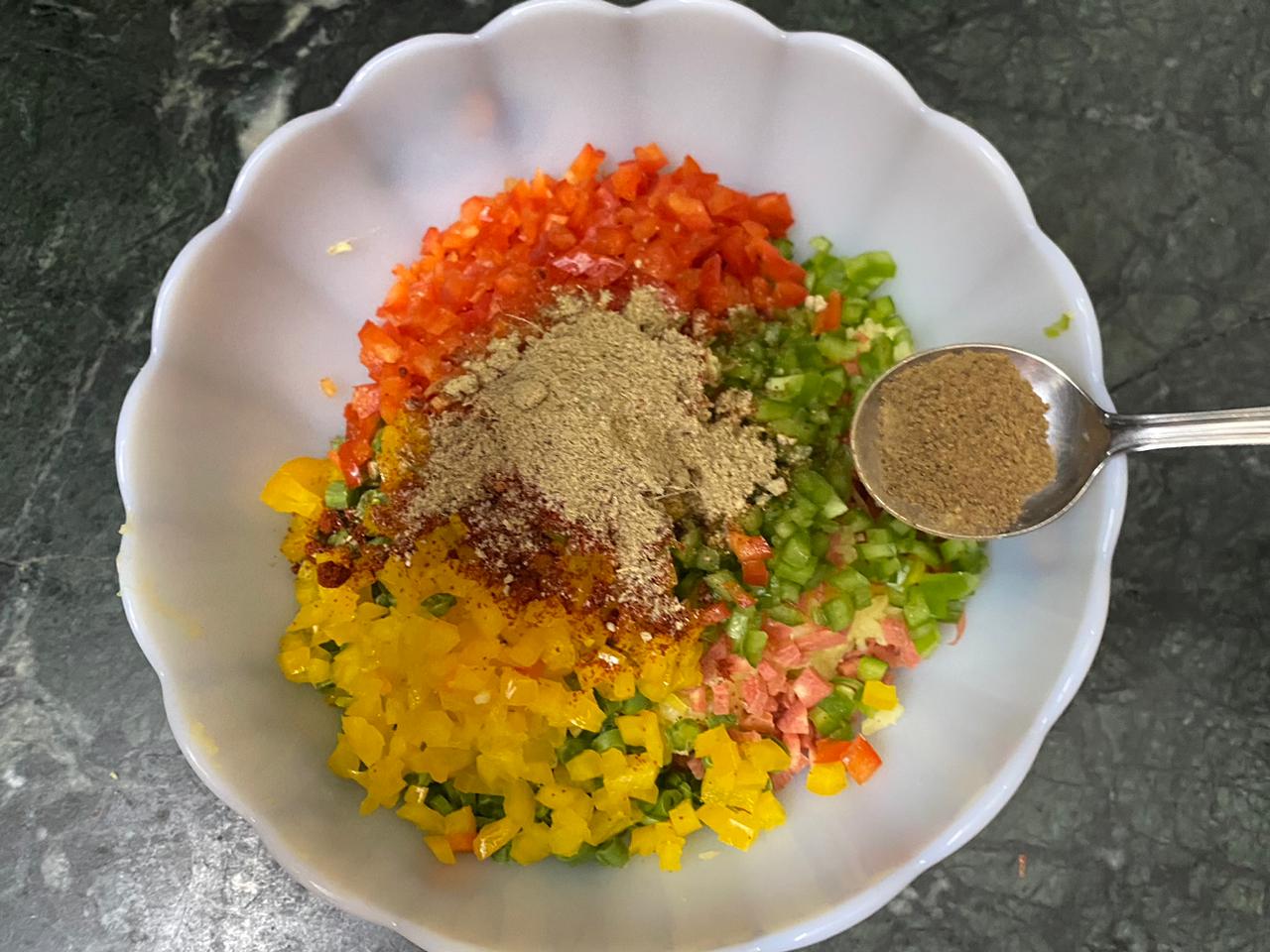 In a bowl, mix potatoes, carrots, French beans, green pepper, yellow pepper, red pepper, green chillies and ginger.