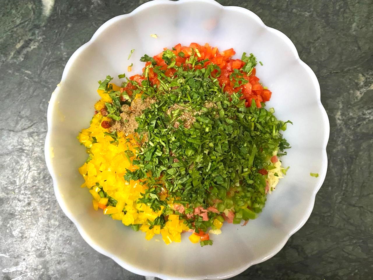 6. You can add more spices as per your taste. If you prefer spicy food, add more chopped green chilies or you can also add some red chili powder here.
